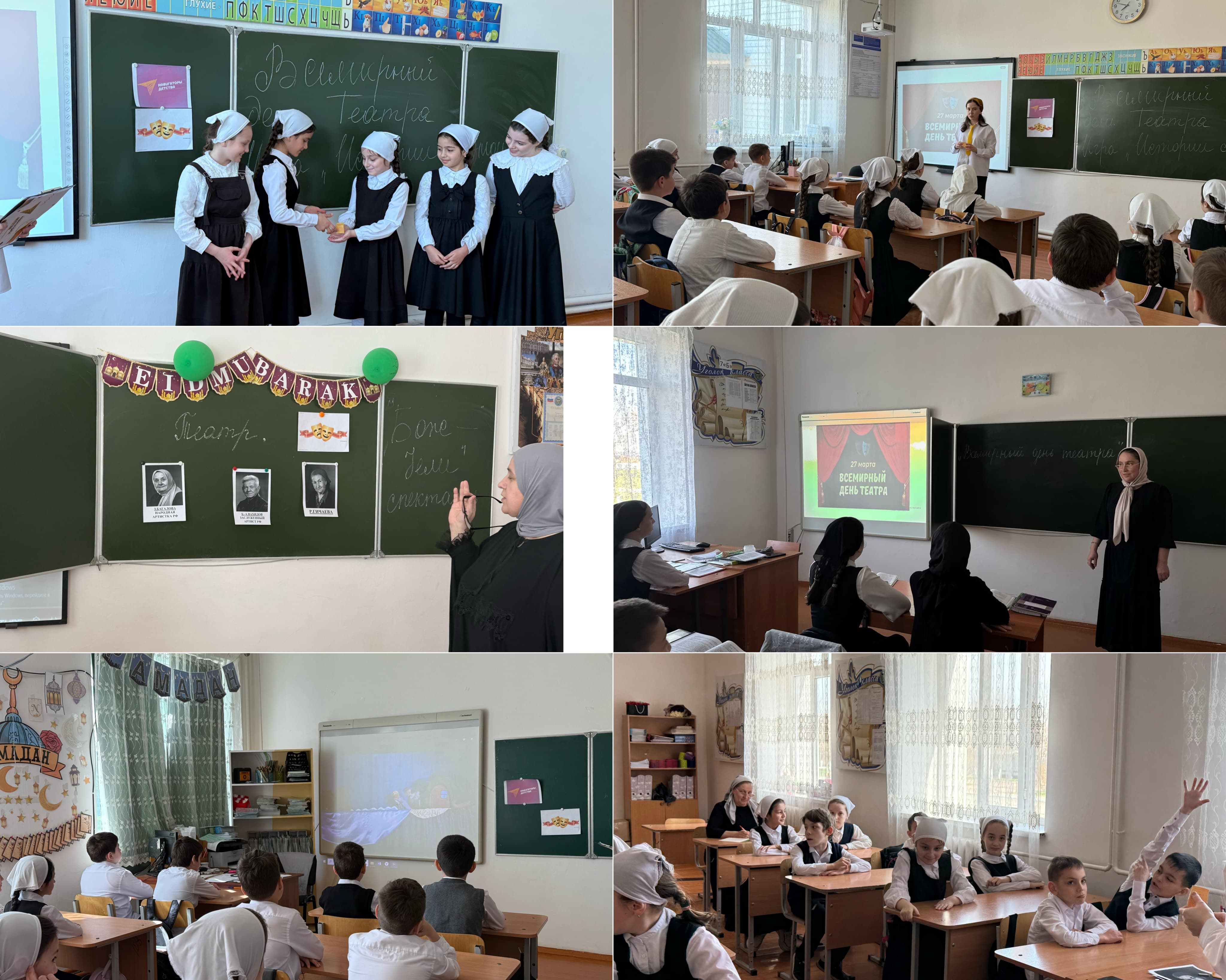 26.03.2025Всемирный день театра🎭 – праздник всех театральных деятелей и ценителей этого искусства.Театральное искусство является одним из древнейших искусств в истории, оно вносит большой вклад в культурное развитие общества. 🎟️В этот день организуются торжественные мероприятия, концерты, проводятся мастер-классы по актерскому мастерству, благотворительные спектакли, премьеры новых постановок, встречи с талантливыми артистами. Мировые деятели культуры оставляют послания актерам театра и деятелям искусства.26.06.2025 в преддверии праздника в нашей школе прошли тематические мероприятия, советник директора по воспитанию Акмурзаева Х.Г. организовала для учащихся 6-10 кл. виртуальный театр : "Ближе, чем кажется", в рамках которого учащиеся посмотрели знаменитые онлайн-спектакли. Также для учащихся 6-7 класса. советник директора провела встречу с руководителем школьного театра Халидовой Х.Г. на котором дети узнали историю чеченского театра им. Х. Нурадилова. Также дети посмотрели чеченский спектакль "Бож-1ели". Для учащихся 2-4 класса провели Игру "Истории с эмоциями".